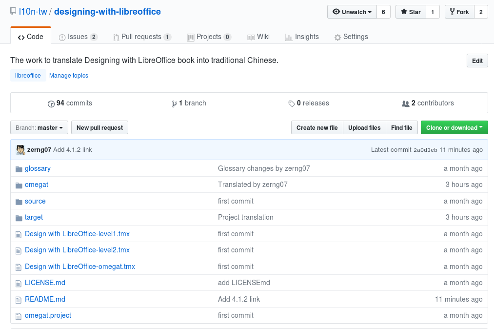 首先我們團隊在 GitHub 上有個 l10n-tw 組織,旗下有個 designing with libreoffice 倉儲,存放我們用 OmegaT 翻譯的檔案。你只要點右上角的「Fork」(分支),就能在「自己的帳號」下再製個倉儲,也就是把 libreoffice-tw 的版本弄一份到你的帳號下。這樣一來,你就能自由修改自己倉儲內的檔案,修改完後上傳提交。