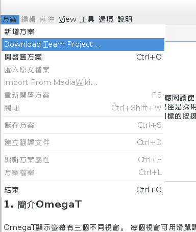 再來我們正式來弄我們的翻譯專案吧!開啟 OmegaT,選擇「方案」>「下載協作方案 (Team Project)」,會看到 Team Project 對話方塊。