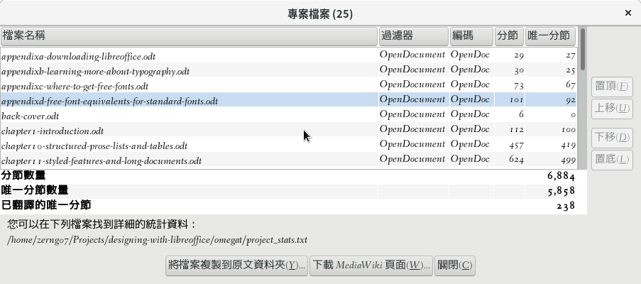 以後要處理翻譯,就打開 OmegaT,點「方案」>「開啟舊方案」或「最近的專案」即可繼續翻譯囉!開啟專案後,會跳出個「專案檔案」的處理視窗,這裡就是你選擇翻譯檔的入口處,可以一直擺著方便你切換,不大需要關閉它。