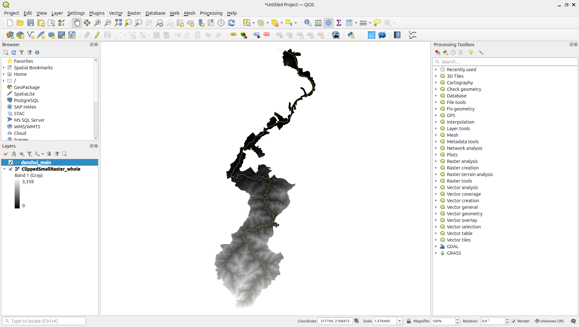 進入QGIS,把剛才做好的淡水河線形和地形圖匯入後。用前文提到的Join Multiple Lines技巧,將淡水河連成一條完整的線。
