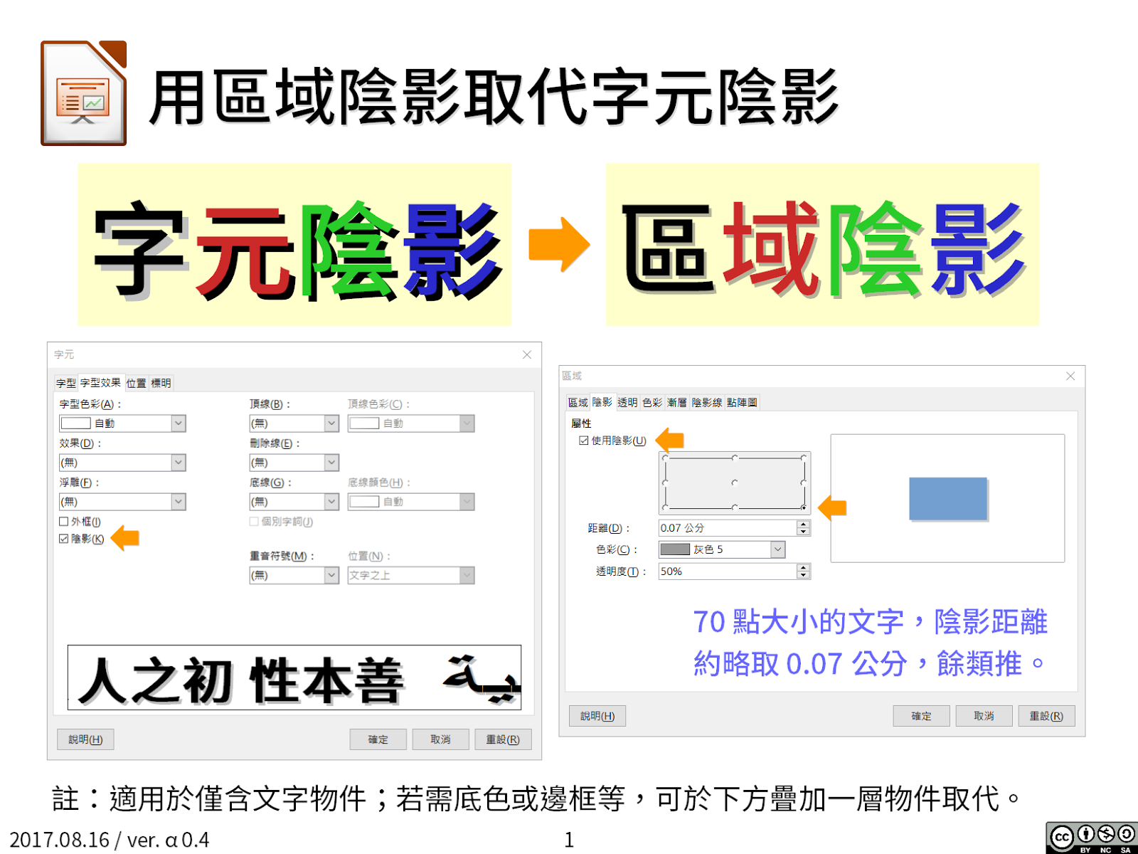 By LibreOffice 正體中文社群, 12 二月, 2018 有時候適當的運用陰影,可以強化簡報上的視覺效果。如果使用 LibreOffice Impress 內建的「字元陰影」效果 (如下圖左側),陰影大小及顏色都很難控制。如果使用「區域陰影」來達到同樣的目的 (如下圖右側),則陰影大小及顏色都可以自行控制。不過,這適用於僅含有文字內容的物件;如果物件需帶有邊框或底色,可以在下方疊加一層物件取代。PS. 在較新版本的 LibreOffice 上,「區域」兩字譯作「區塊」。 LibreOffice 正體中文文件