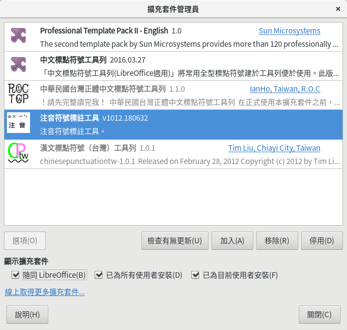 這個注音標注擴充套件名稱為「Bopomofo Annotate」,中文為「注音符號標註工具」,最近剛提交到 LibreOffice 的擴充套件網站上,還在審核階段,所以目前必須先在 LibreOffice Extensions 網站上註冊、登入後才看得到。如果覺得從 LibreOffice Extension 上下載太麻煩,也可以直接前往開發者的 GitHub 專案下載:https://github.com/marklh9/BopomoAnnotate/releases,選擇目前最新的 bopomo-v1012.180632.oxt。