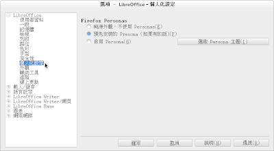 小提示:由於 LibreOffice 介面上的顯示文字是透過自身的配色方案控制,所以不會隨著 Persona 的文字色彩設定而更著變換,在你未更動之前預設都是黑色的。因此有時佈景的 Persona 圖樣過深,會使得文字看不清楚。你可以透過 [工具] > [選項] > [外觀],來調整文字配色,亦或是改用其他不會影響文字閱讀的 Persona。