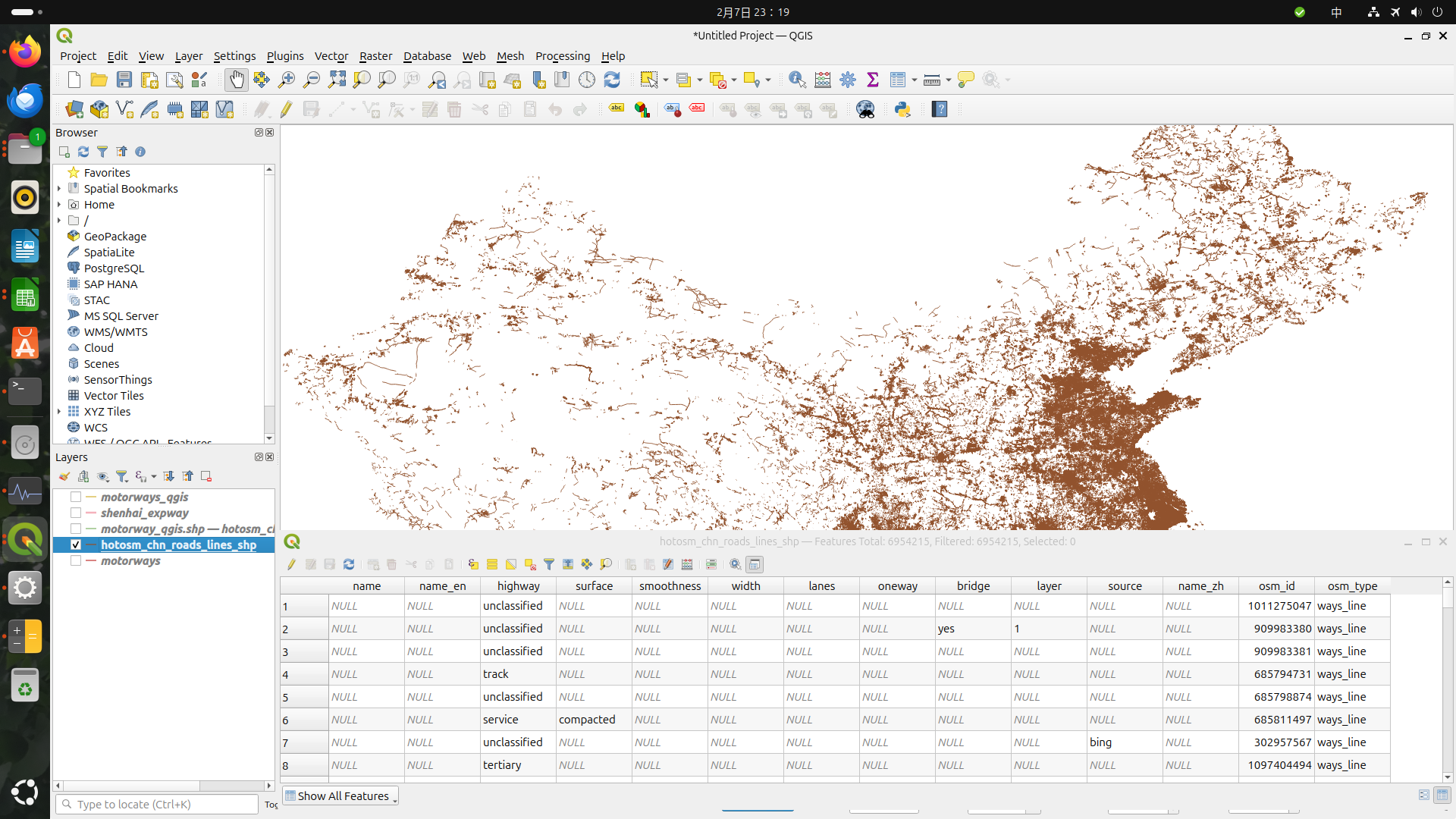 用極端點的例子,我想製作中國的高速公路網圖,可以在人道救援資料集找到擷取OSM中國所有道路的資料集,你再從中篩選出高速公路資料集即可。說來容易,但是檔案抓下來就1.8GB,直接匯入QGIS是不會當掉,但是快七百萬個Features是要等到天荒地老?
